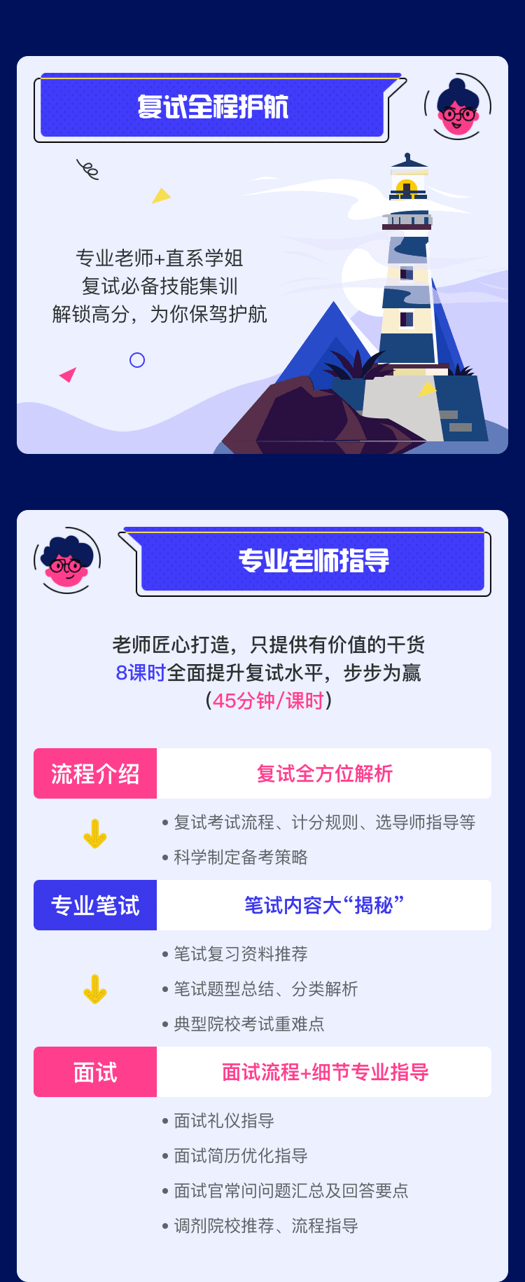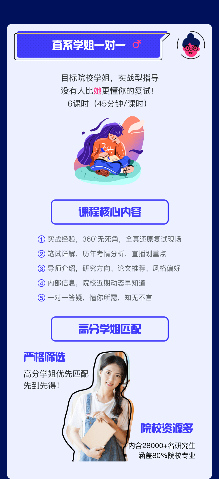 1.经6层严格筛选的高分学长 2.对目标院校专业课研究透彻 3.能够为学员提供个性复习规划、梳理专业课重难点、真题资料解析及答疑等 4.上课认真负责,能够及时解决学员疑问。